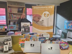 El 13 de mayo de 2022, coincidiendo con la entrega de material tecnológico a los niños del Hospital Universitario de la Paz de Madrid, iniciamos un nuevo proyecto consistente en dotar de videoconsolas, videojuegos, tablets o proyectores las aulas o salas comunes donde suelen pasar parte de su tiempo los niños ingresados tanto para el pasatiempo como para el aprendizaje de estos peques.